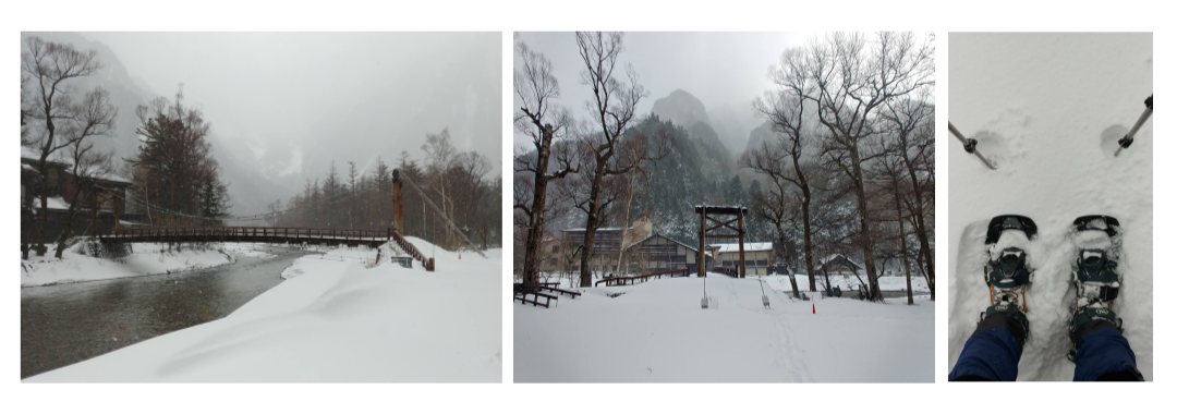 3일차 | 가미코치 히라유 | 노선버스 도보 전용버스 | 08:55-09:05 | 가미코치 이동 스노슈 (서양설피) 가마터널 - 다이쇼 연못 - 타시로 습원 - 갑빠바시 (왕복 14KM) 히라유 온천 이동 ![]() ![]() | 조 : 호텔식 중 : 도시락 석 : 호텔식 |